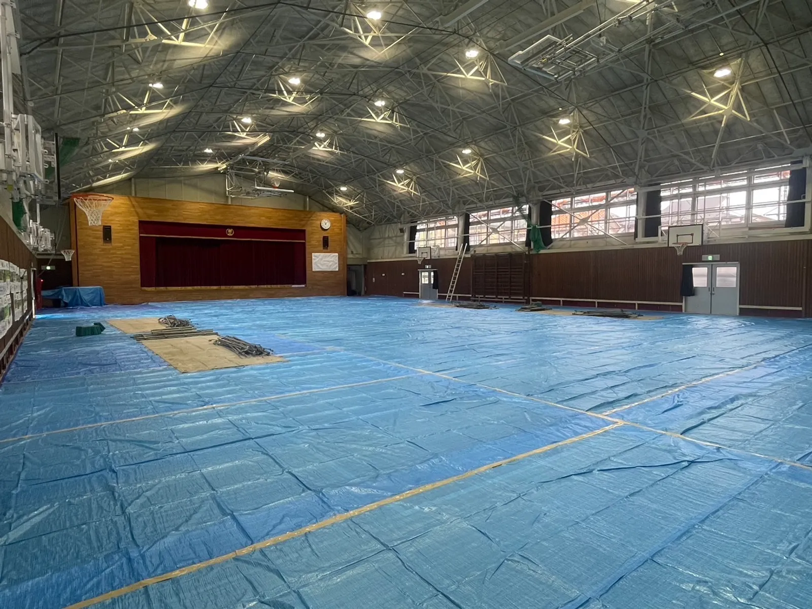 屋根の工事によりゴミが落ちてくるので体育館内の床は養生しています!