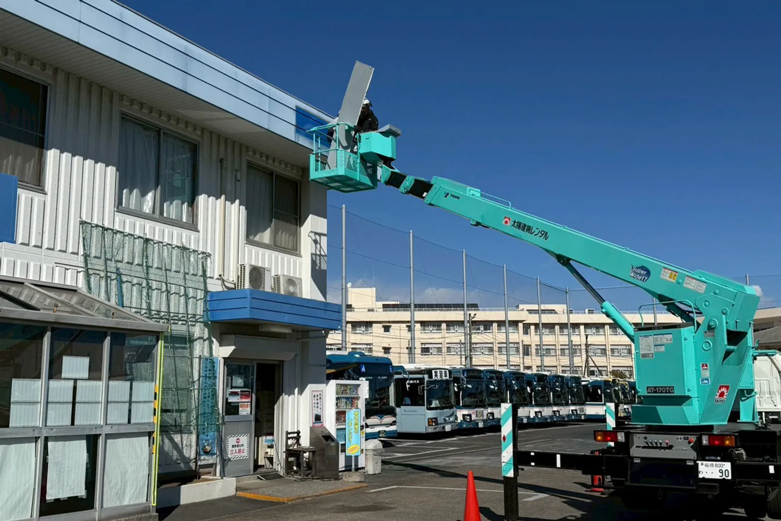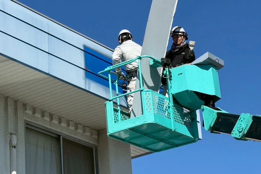 高所作業車を使用して看板撤去工事中!!