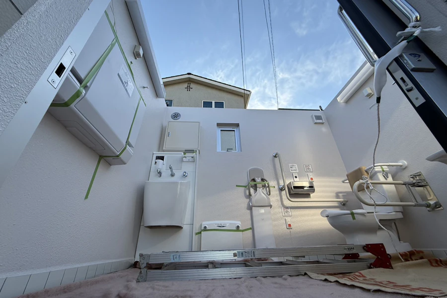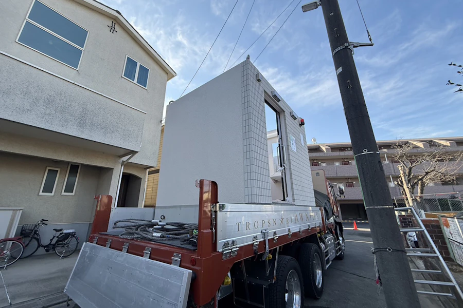 こちらのトイレ、既に工場で設備や内外装すべて出来上がった状態で現場に運び込み