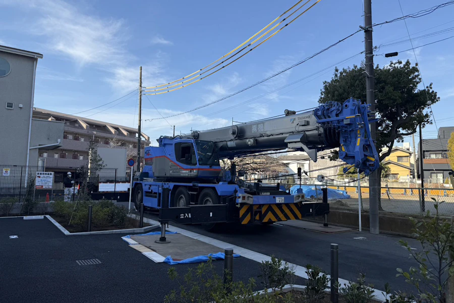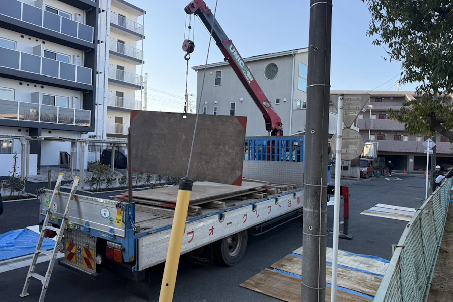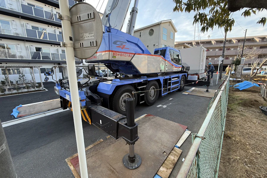 まずはラフタークレーンの脚の部分でアスファルトが傷つかないように